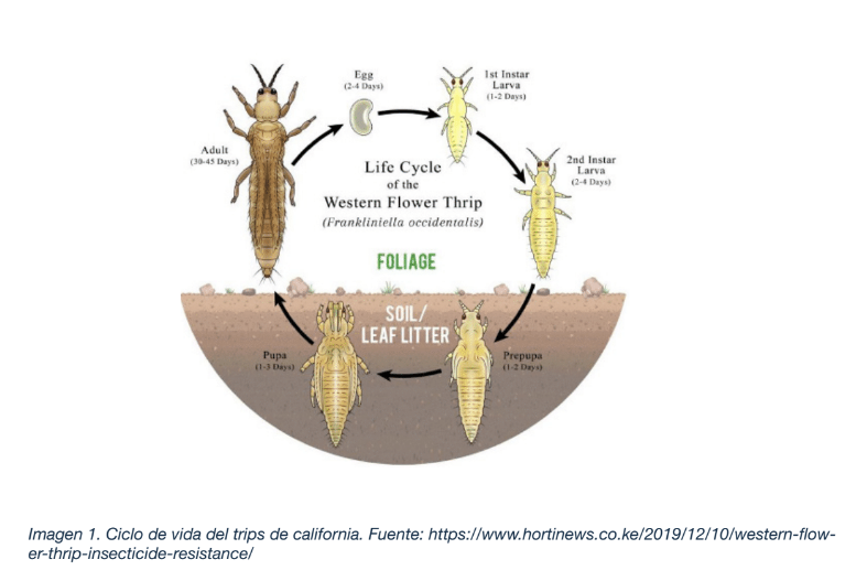 Una vez ovopositados en hojas o frutos, los huevos eclosionan en 2-3 días. Después de eclosionar, el trips pasa por dos estados larvarios para llegar a preninfa y ninfa antes de llegar a adulto. Como se muestra en la imagen 1, una parte del ciclo biológico ocurre en el suelo, pre ninfa y ninfa. El trips californiano completa su ciclo de vida en 10 a 20 días, entre 20 y 35ºC.