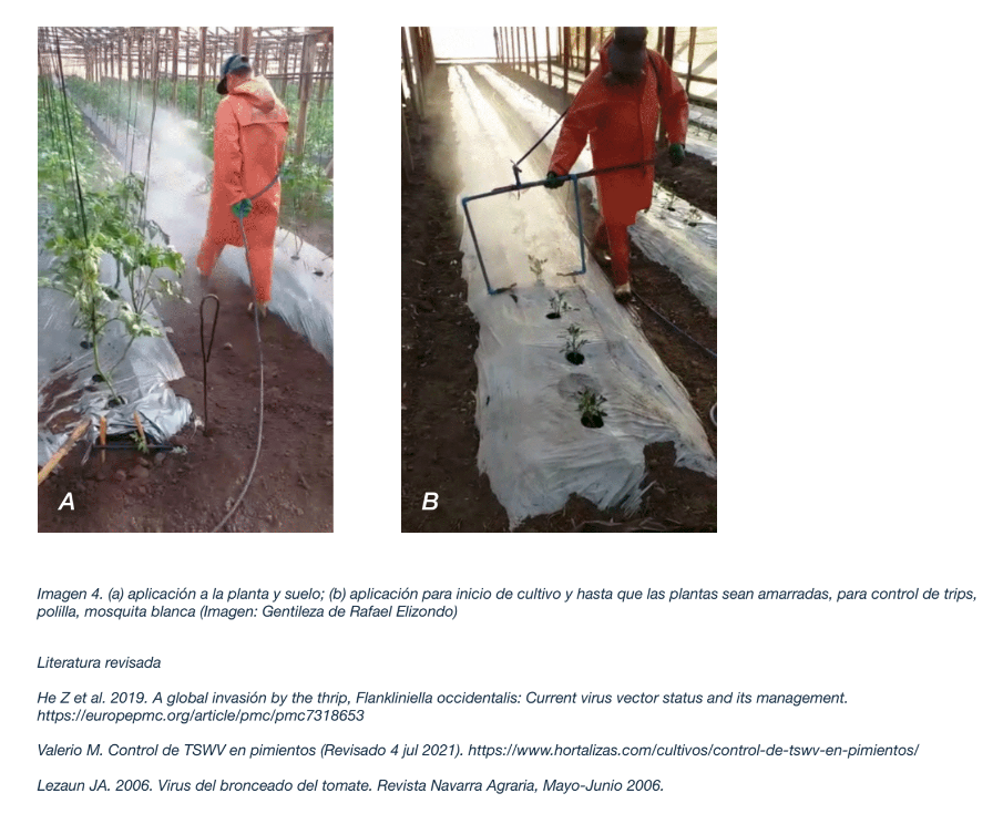 • El uso de insecticida neonicotinoide en la inmersión de bandeja o en drench al día siguiente del trasplante ayuda a evitar infestación temprana. Aunque esta medida debe ser tomada en el vivero.
