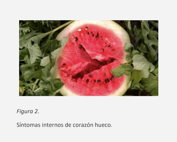 Una condición conocida como corazón hueco se asocia a menudo con tasas de polinización inadecuadas. Con un corazón hueco, se forman huecos o cavidades en la pulpa dentro de la fruta (Figura 2). Esta condición es más común en los frutos sin semillas (triploides), y suele ser el resultado de problemas con el número, el espaciamiento o la distancia de las plantas polinizadoras, o de una mala sincronización de la producción de polen y la receptividad femenina al polen.