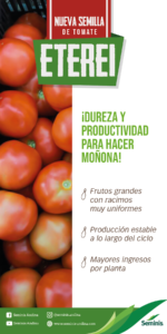 Ya está disponible en Colombia la nueva semilla de tomate indeterminado, tipo milano o “larga vida” Eterei, una planta de entrenudos cortos y racimos muy uniformes que brindará al agricultor producciones estables, a lo largo del ciclo; caracterizadas por frutos de gran calibre, obteniendo más kilos por planta.