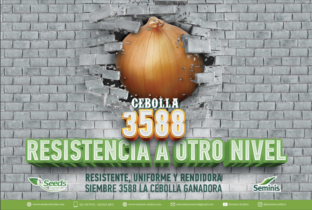 La Semilla de Cebolla 3588 es un material que reúne características como resistencia, adaptabilidad y rendimiento, sin dejar atrás su forma (gran tamaño, color y uniformidad), así como excelente pos cosecha que responde satisfactoriamente con los requerimientos del mercado nacional y la demanda externa de cebollas de bulbo colombianas, favoreciendo y valorando el trabajo de los productores del país.