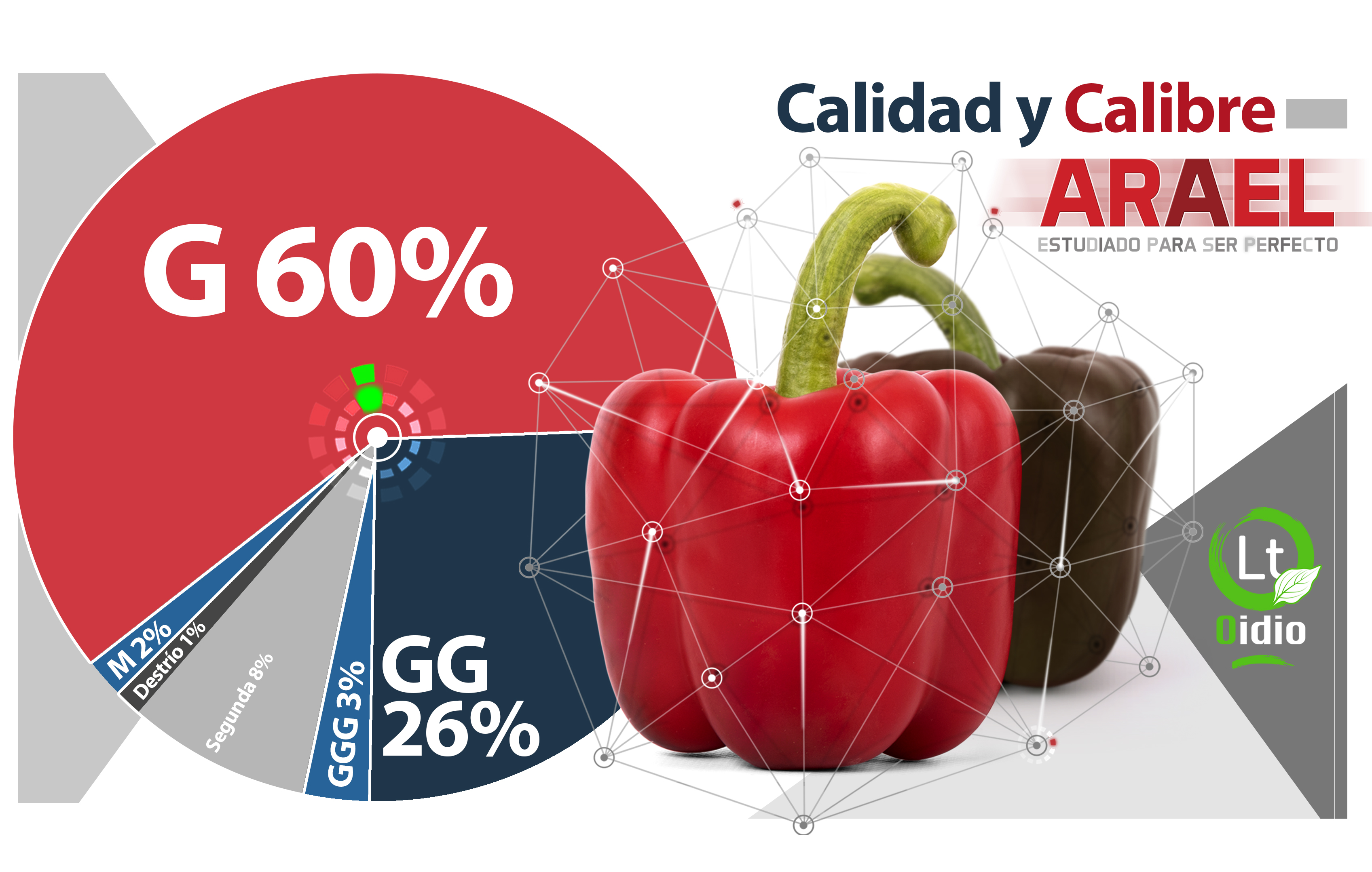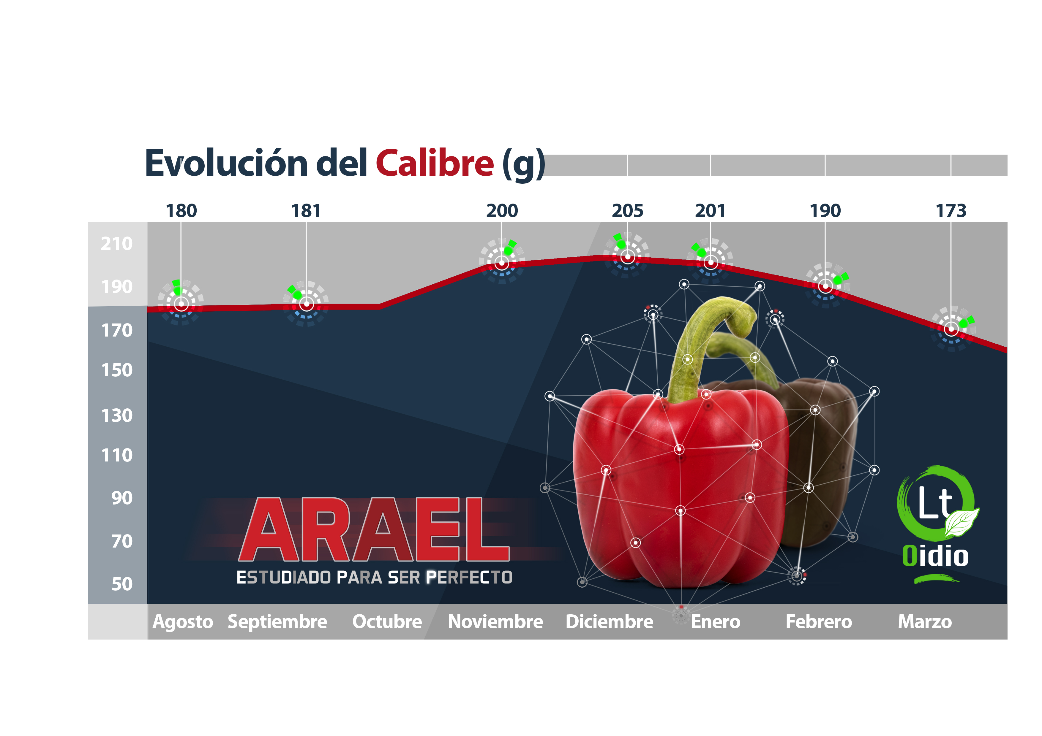 Arael es un pimiento california rojo con resistencia intermedia a oidio, recomendado para plantaciones de mayo hasta principios de julio en Almeria. Mantiene el calibre mayoritariamente G durante todo el ciclo de cultivo además de ofrecer una excelente calidad de fruto, con un elevado porcentaje de primera calidad y extra y muy bajo nivel de microcracking