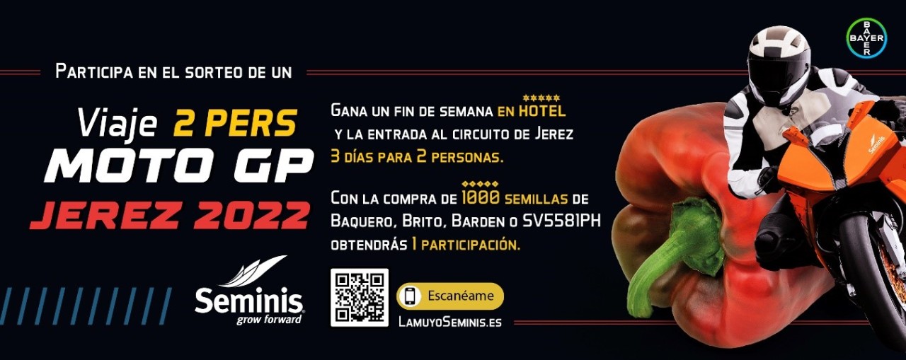 En Seminis hemos puesto en marcha un sorteo para promover la Solución de Lamuyo para otoño y verano con sus productos número uno en ranking, Brito, Baquero, SV5581PH y Barden. La campaña arranca este mes de abril de 2021 y finalizará el 1 de abril de 2022 con una promoción muy especial que permitirá a los participantes ganar un fin de semana en el Gran Premio de Motos GP de Jerez 2022, en hotel de 5 estrellas.