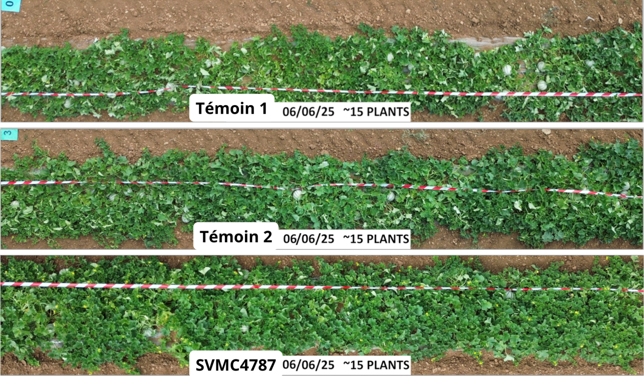 Photos des plantes de SVMC4787 avant et après récolte face à 2 témoins du créneau, plantation du 25/03 (Languedoc)