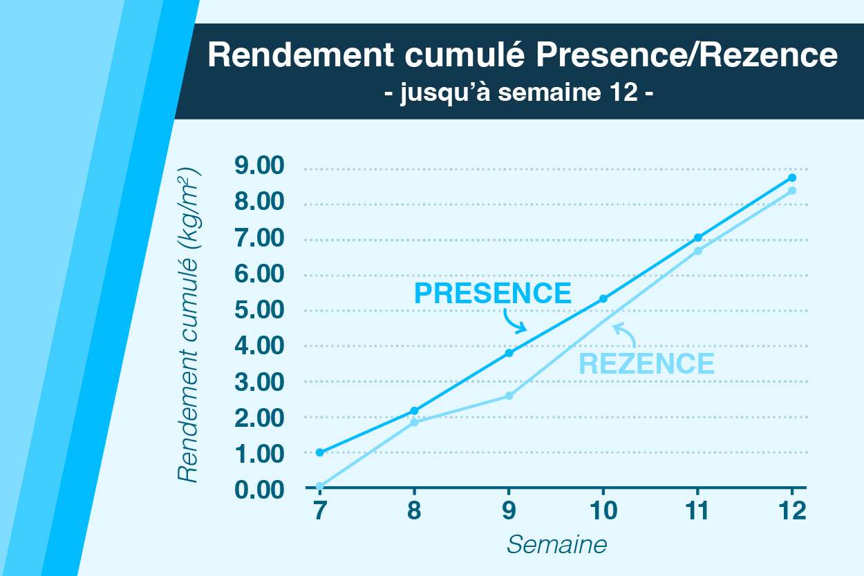 Vous trouverez ci-contre les résultats d’un essai réceptionné sur le Sud-est mi-novembre 2025 pour Presence et une semaine plus tard pour Rezence. Malgré une réception plus tardive, on note une production de Rezence qui rattrape rapidement sa semaine de décalage. Cela confirme les données de l’année dernière, avec des premières récoltes plus importantes que celles de Presence en début de saison. La densité de départ a été de 2.7 et le porte-greffe utilisé est Equifort. La taille a été effectuée à 5 fruits.