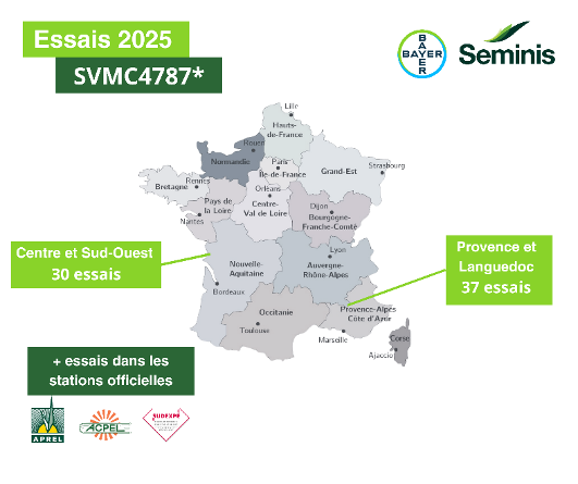 Nous avons multiplié les différents contextes de plantations de SVMC4787* afin d’évaluer finement les performances de la variété (différentes régions, méthode de production et créneaux). En tout, plus de 70 essais ont été mis en place dans tous les bassins et stations d’expérimentations officielles.