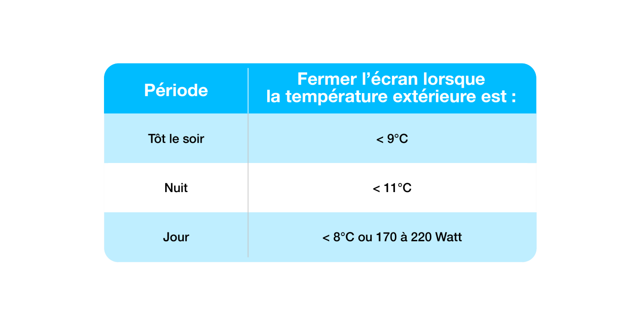 Essayez d'éviter une chute de température brutale. Cela peut provoquer une inactivité de la plante. Si la température extérieure n'est pas trop froide, vous pouvez ouvrir l'écran à plus de 170 Watts. S'il fait froid, réglez alors la limite de rayonnement légèrement plus haut. Il n'est pas utile d'ouvrir l'écran pour ensuite avoir besoin d'une température de tuyau de 55 à 60 °C. Cela n'est pas bon pour la plante et pas bon pour votre portefeuille !