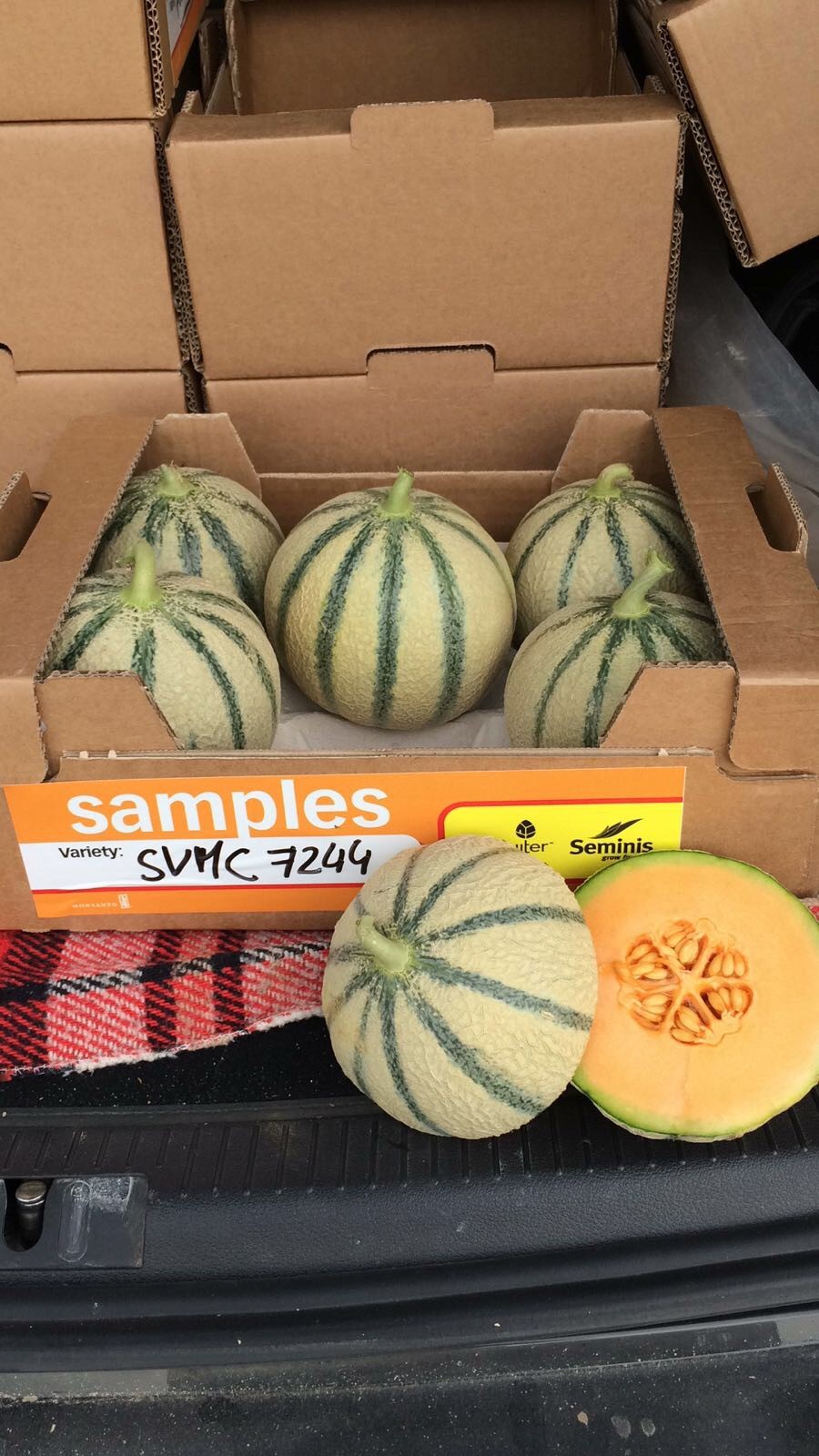 En plus de la résistance intermédiaire IR Fom1.2 qui aujourd’hui est devenue le socle commun de toutes nos innovations variétales melon, SVCM7244 présente également une bonne tolérance puceron, à nouveau vérifiée dans les essais 2017. Le calibre moyen observé cette année est légèrement supérieur à celui obtenu dans les essais de 2016, ce qui reflète les tendances de la saison 2017. La présentation des fruits se distingue par une robe bien écrite et bien tranchée. Les fruits se récoltent au cerne car la couleur de la robe n’évolue pas trop rapidement. La qualité interne a été au rendez-vous, en particulier dans le Centre-Ouest où les taux de sucre ont atteint des niveaux remarquables, toujours supérieurs à 14-15° Brix. Seules quelques parcelles du Sud-Ouest ont donné des fruits un peu moins sucrés, conséquence en général d’un excès d’humidité. Grâce à un cycle relativement court pour une variété IR Fom1-2, SVCM7244 se place comme le complément de gamme idéal de notre référence SV6556MC, chacun sur son créneau de production (cultures sous chenilles pour SVCM7244, cultures sous bâches pour SV6556MC).