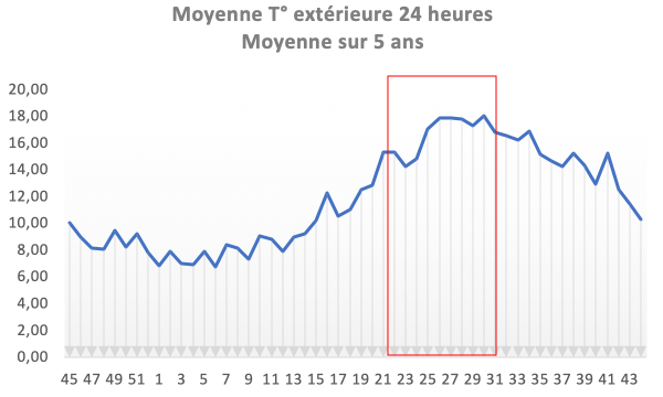 Les nuits se raccourcissent de plus en plus pour ne plus durer que 6 heures au moment du solstice d’été. Il faut maîtriser au mieux les moyennes 24 heures, en réalisant les nuits les plus fraîches possibles. C’est surtout en fin de nuit, à l’aube, que l’on peut « gratter » des points sur la moyenne 24 heures. Ne pas hésiter à demander des consignes d’aération à 15°C dès 1h30 avant l’aube, si la température extérieure est supérieure ou égale à 16°C sur cette période.