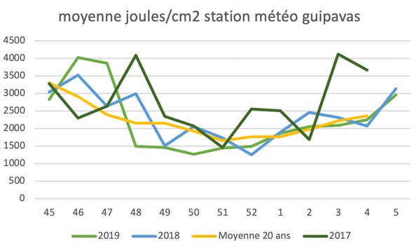 Statistiques en joules/cm2 à Météo France Brest, sur une période de plus de 20 ans