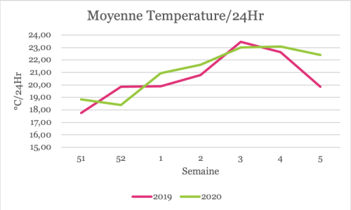 Des consignes de température/aération ont été maintenues en janvier (20+3C° la nuit - en fonction de la quantité de lumière). En arrivant sur F6 (voir tableau suivant), la consigne de nuit est descendue à 16C°, avec une influence de +4C° (de 330j-600j). Il y a également une influence des Watts de +3C° sur la consigne.