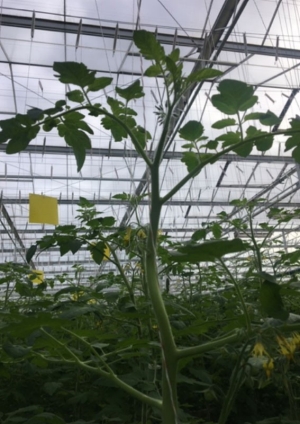 Pour faciliter l’installation des Macrolophus, les plantes ne sont pas effeuillées depuis S1. Le premier effeuillage est prévu pour S9. Les bourgeons qui ressortent en bas de la plante sont enlevés régulièrement pour éviter que les Macrolophus y pondent. Les plantes sont palissées et ébourgeonnées 1fois par semaine. Avec les températures élevées dans la serre, la croissance atteint 28cm par semaine.