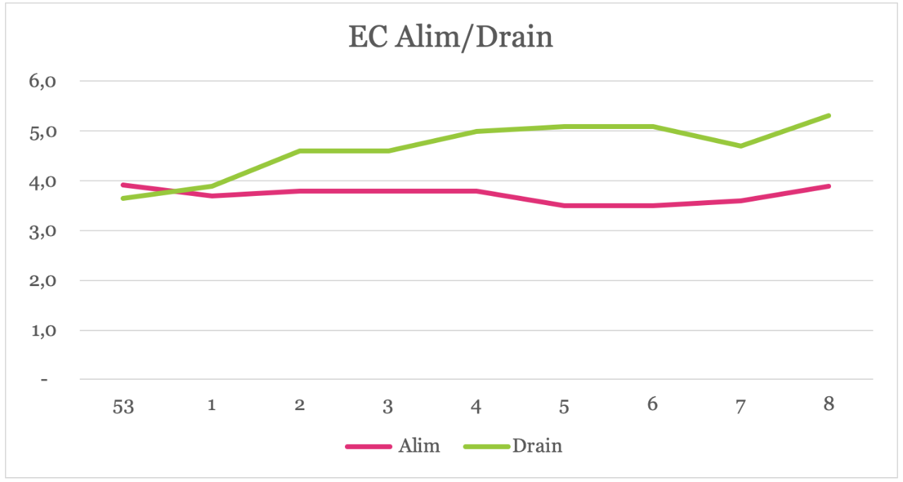 Pour maintenir une bonne qualité des fruits, nous arrosons la nuit à 4.5ms, avec objectif de ne dépasser pas 6% sous saturation. Le rayonnement en journée commence d’être fort (650w) et les arrosages sont adaptés pour répondre à ce stress (petits doses, fréquentes).