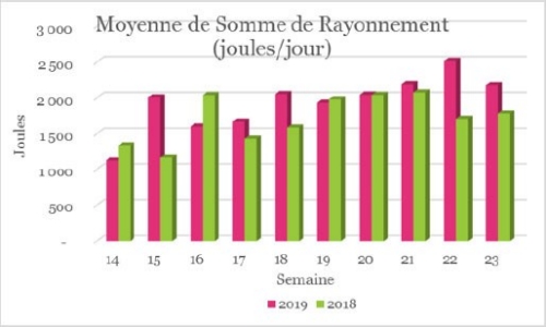 L’ensemble des plantes a atteint le stade F28,1 en floraison fin de semaine S23.