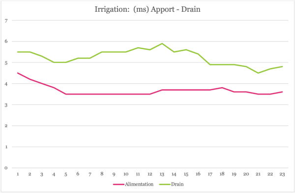 Le graphique ci-dessous donne les EC apport ainsi que les EC du drainage depuis le début de l’année.