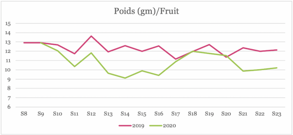 Nous avons constaté une augmentation de poids moyen au mois d’Avril qui a rechuté au mois de Juin. Le poids moyen augmentera sur les semaines suivantes.
