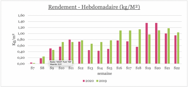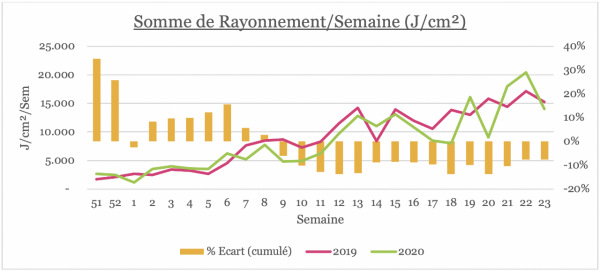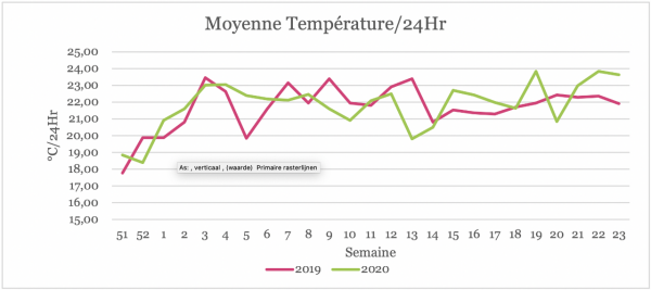 Avec une fin de mois de Mai très ensoleillée, nous sommes arrivés à diminuer l’écart de perte de lumière (<14%) par rapport aux moyennes des années passées. Malgré le manque de lumière, nous avons maintenu des moyennes températures /24hr plus élevées.
