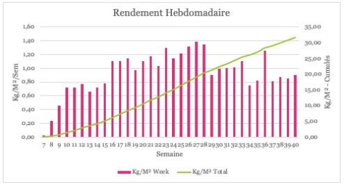 Depuis mi août, le rendement moyen est de 0.8Kg/m²/semaine.