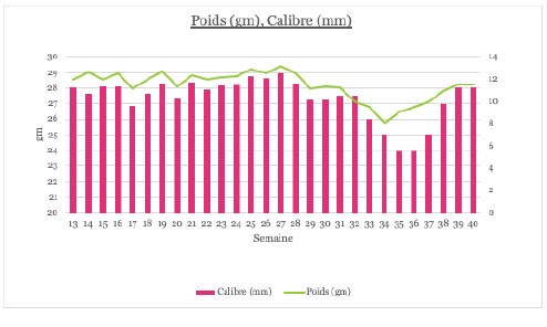Depuis S33, il y a une deuxième baisse en diamètre et en poids également (graphs ci- dessus). Ces fruits correspondent à une nouaison lorsque la moyenne était de 25degC/24h dans la serre.