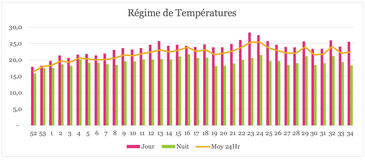 Depuis S25, nous avons cherché à maintenir des températures sur 24Hr le plus bas qu’on pouvait pour maintenir un niveau de vigueur acceptable. C’est-à-dire la nuit réglée à 14°C et au du lever du soleil à 16°C.
