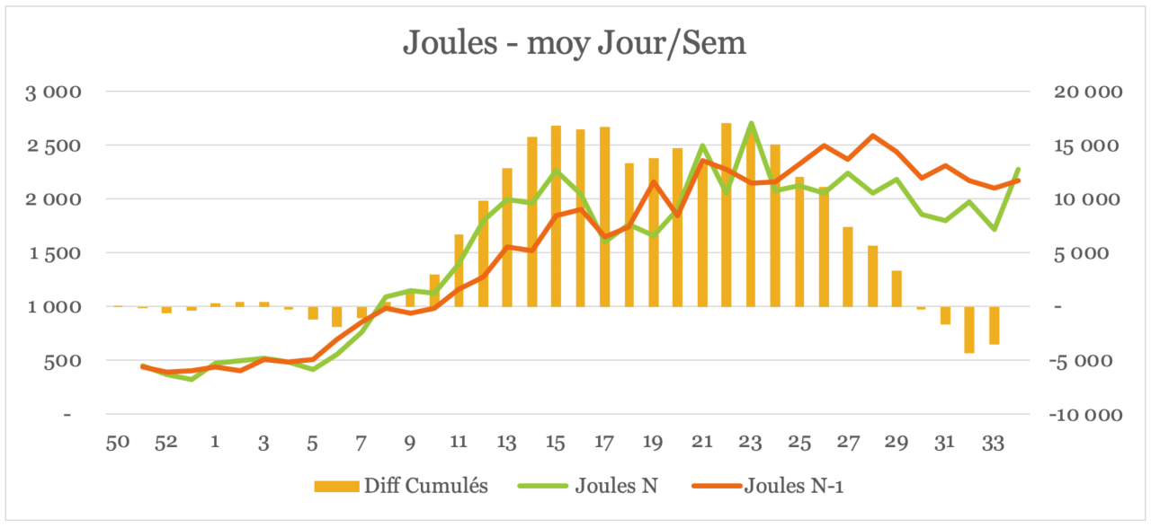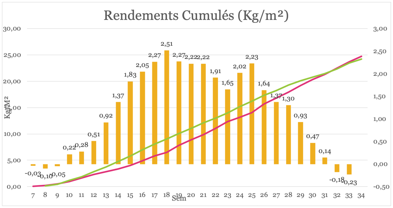 Depuis S25, nous constatons une baisse significative de production. L’avance de 2.23kg/m² qu’on a eu, a diminué à 0.23kg/m² de retard à la fin de S33.