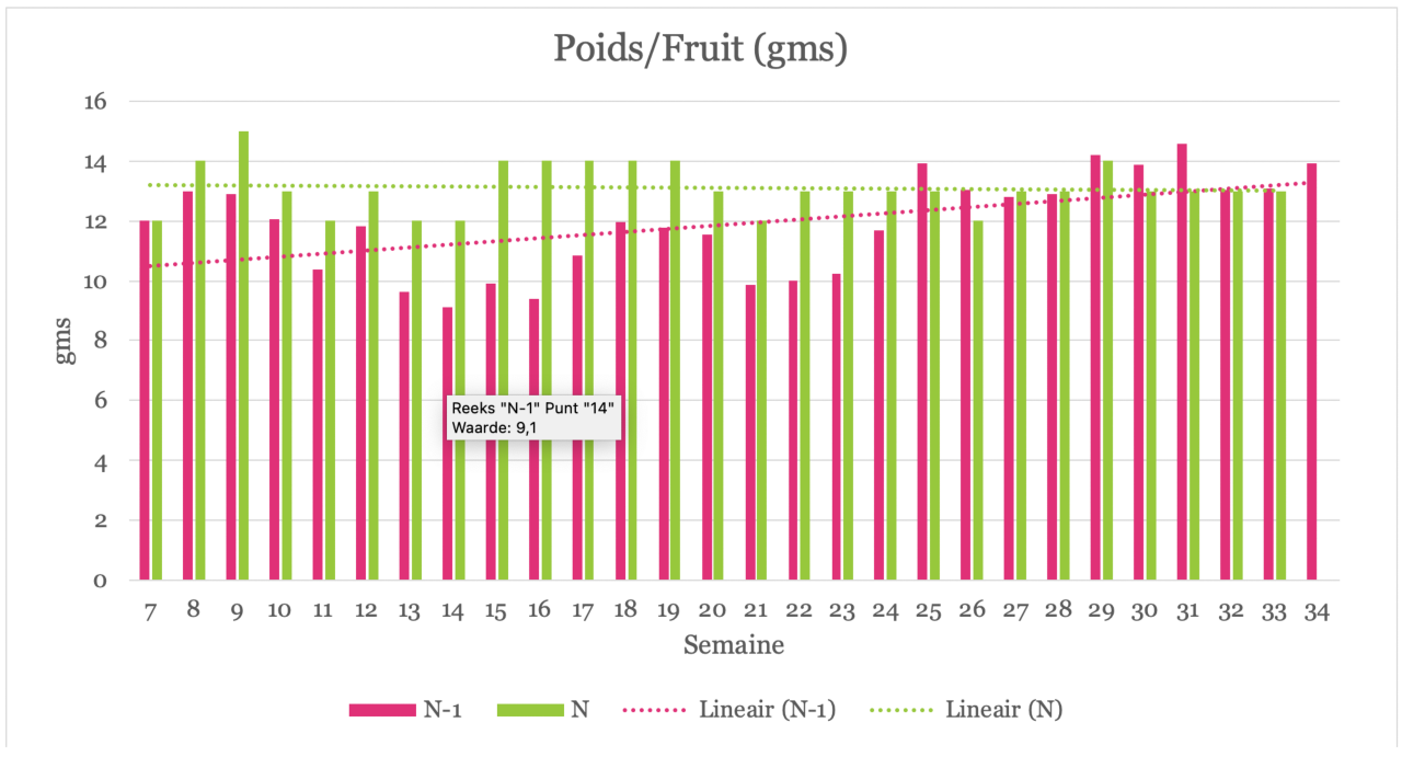 Pendant la période estivale, le poids des fruits est resté très stable, autour de 13 – 14gms.