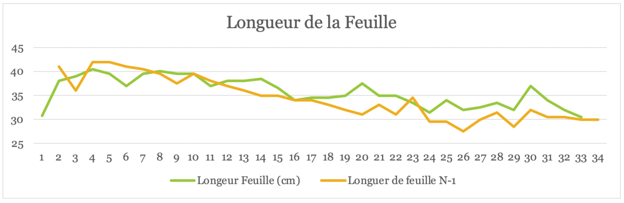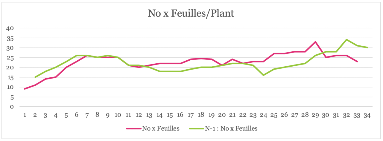 En anticipant une perte de surface foliaire (longueur de feuille), nous avons laissé davantage de feuilles sur la plante pour la période estivale (nécessaire pour maintenir un bon climat dans la serre dans le sud-ouest). Cependant, avec l’absence de lumière cette été, les feuilles ne sont pas raccourcies autant qu’on attendait (voir tableau) et donc, nous avons diminué le nombre de feuilles par plante, de 32 à 25 feuilles à partir de S29 pour faciliter la récolte.