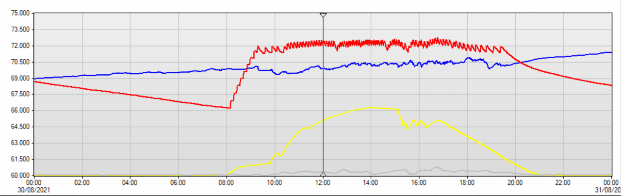 L’EC apport plus élevé qu’attendu en journée est une réflexion du manque du soleil (en été, nous avons une consigne de 3.8ms -0.5ms de 650w – 950w).