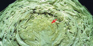 Symptoms manifest as brown to black necrotic tissue at leaf tips. Leaves surrounding the growing point are particularly susceptible to this disorder. Tipburn is readily seen when exposed plant structures, such as leaves and curds, are affected. However, damage to the heads of Brussels sprouts, cabbage and Chinese cabbage may go undetected until they are cut open. In severe cases of tipburn, the head is soft and the plant is dwarfed.