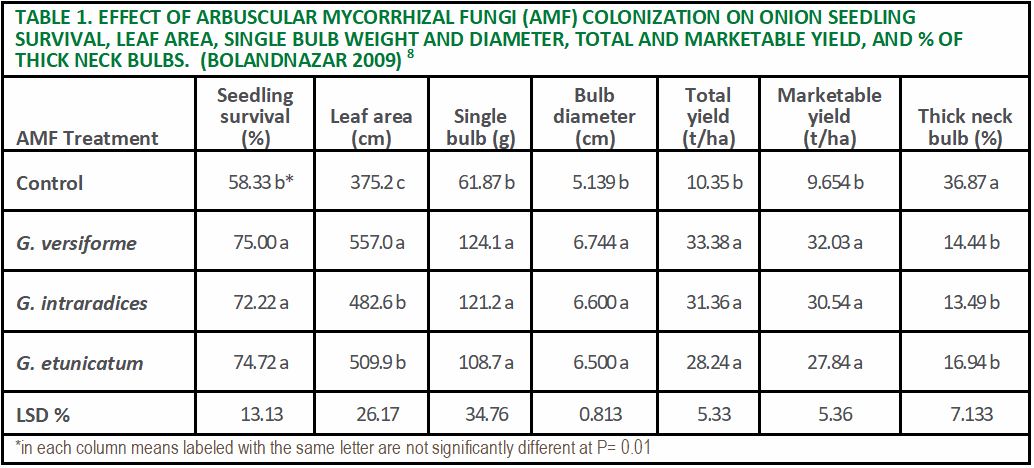 A study on the inoculation of onion seedlings with three different AMF found increased seedling survival, leaf area, bulb diameter, and yield with the three AMF tested (Table 1).8 A second study looking at the effects of mycorrhizal inoculation on both lettuce and onions grown in saline soils found that inoculation resulted in increased growth of both lettuce and onion plants and an increased tolerance for higher salinity levels.9 Another study found that AMF inoculation of cucumber seedlings resulted in lower levels of root knot nematode development, but there were variations in the level of effectiveness of the three AMF tested.10