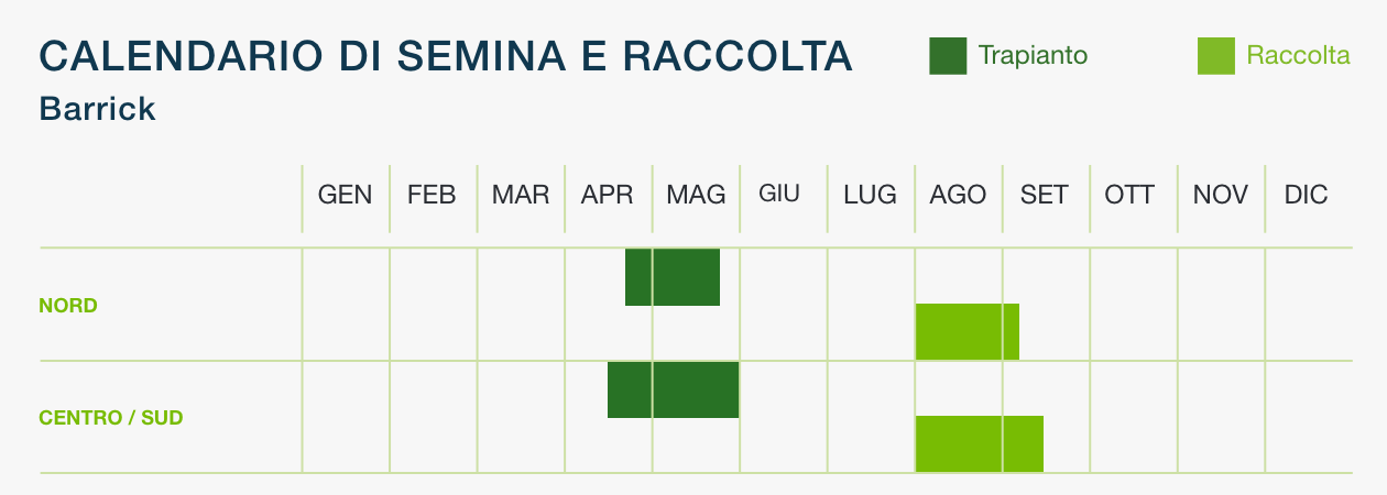 Con la sua pianta forte, vigorosa e sana, capace di allegare anche a temperature elevate, Barrick è il nuovo pomodoro da industria prismatico Seminis adatto a tutti gli areali di coltivazione italiani. Facile da coltivare in ogni condizione ambientale, grazie all'eccellente copertura dei frutti,all'elevata fertilità e all'ottima tenuta in campo. Perfetto da lavorare, grazie al rosso intenso delle bacche che lo rende la scelta ideale per passata, polpa e concentrato.