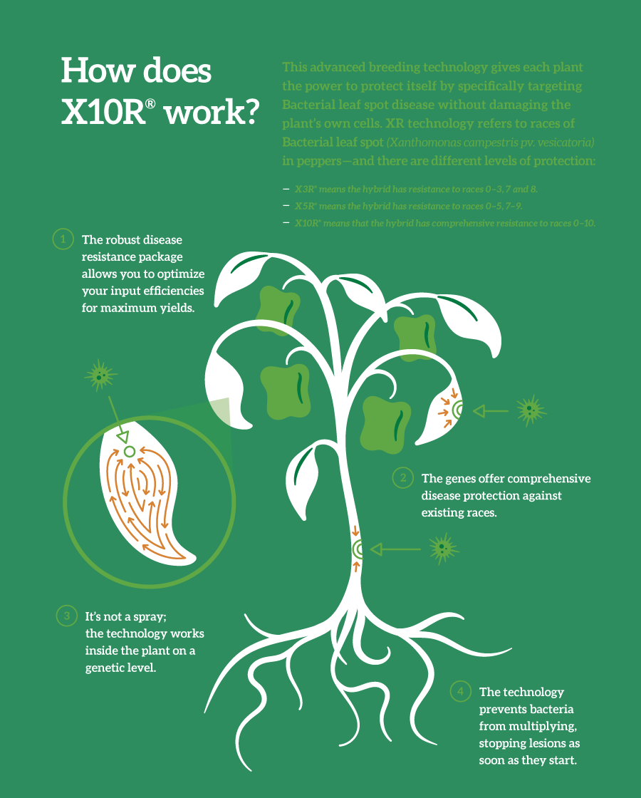 Now, we are the first to deliver high-quality peppers that harness the full potential of X10R® technology. Discovered through traditional plant breeding efforts, X10R was developed through screening thousands of parental lines and hybrids. This breeding innovation will serve as the industry-leading disease resistance package from Seminis peppers, offering our growers the best comprehensive defense against all races of Bacterial leaf spot (XR).