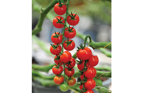 Tomate indeterminado tipo cherry para cosecha en racimo uniforme tipo espina de pescado con 14 a 16 frutos.