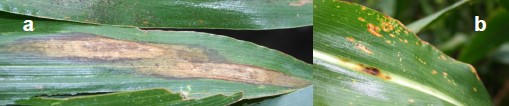 Figura 1. Lesiones de la mancha foliar norteña (a) y sureña (b).