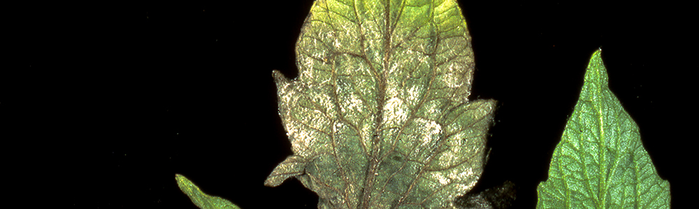 Los primeros síntomas se muestran como lesiones acuosas/aceitosas en las hojas que después se tornan en lesiones púrpura y marrón, seguido por la aparición de micelio (sobre todo en el reverso de la hoja). Las hojas mueren rápidamente, y no son el único órgano afectado, pues se pueden infectar tallos, brotes y frutos.