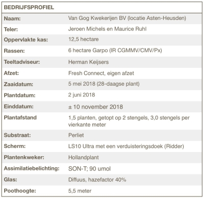 Garpo staat, met name door de iets lagere bladafsplitsing, bekend als een zeer arbeidsvriendelijk ras. Jeroen: ‘De lagere bladafsplitsing wordt in de productie gecompenseerd door af en toe een setje aan te houden. Door de kracht van Garpo is dat geen enkel probleem. Met zo’n constante productie is de arbeid goed te plannen en bovendien is de oogstprognose voor de afnemers ook heel betrouwbaar. Het gerealiseerde vruchtgewicht over het gehele seizoen is 45% 40-ers en 45% 35-ers met 10% overig.’