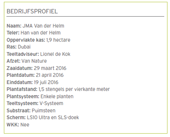 ‘Ik ben altijd al een generatieve teler geweest. Juist daarom past Dubai zo goed bij mij: dit ras móet je wel generatief telen. Zolang je generatief teelt, groeit het gewas niet te vol. Dubai maakt heel gemakkelijk zijn ranken aan, dus daar moet je goed op sturen. Maar als je het goed doet, krijg je geen te lange ranken. Dubai kan daardoor in de herfst soms wat extra werk geven, maar dat maakt hij ruimschoots goed in de productie.’