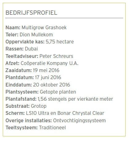 Over de kwaliteit van Dubai is Dion bijzonder te spreken: ‘Topkwaliteit! De komkommers zijn door het toppen op de stam iets langer dan normaal, maar ook op de scheuten komen mooie komkommers van de goede lengte. De vruchten worden niet te lang en bovendien is Dubai sterk tegen Mycosphaerella.’