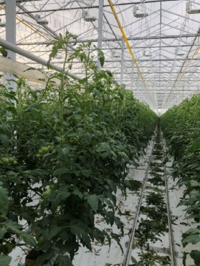 Verder is er gestart met krijt op het dek tot ongeveer de 3de tros bloei. De plant bleef slank van de hoge etmalen maar ook van de hoog ingestelde nachttemperaturen om de vruchtgroei niet te veel voorrang te geven. Etmalen zijn ondertussen gezakt naar 19-20 oC. Dit gewas(zie foto) vraagt bij de 6e tros bloei momenteel bij etmalen rond de 20 oC, 900 joules aan lichtsom per dag. Op donkere dagen moet er dus bij belicht worden en indien er pas vanaf 1-10 stroom is ingekocht moet het etmaal zakken om de trossen sterk te houden. Belichten doen we om de dag te vervroegen en te verlengen maar vooral om het vochtdeficiet overdag te verhogen, want dit gewas produceert steeds meer vocht. Met name aan het einde van de dag is het zaak het vochtdeficiet hoog genoeg te houden en de wortels niet teveel te verwarmen met de buis. Met een mooie dag weer volstaat het als je de lampen alleen aan het einde van de dag aanzet. Vorige week is voor het eerst het doek dicht gelopen in de namiddag om te ontvochtigen. Het vochtdeficiet steeg hierdoor aan het einde van de dag. Als het vochtdeficiet heel de dag 6-7 is er minder noodzaak het doek dicht te trekken. Is het gemiddeld 4-5 en moet er water uit de kop gestookt worden, dan zeker wel het doek sluiten. Het streef vochtdeficiet bedraagt dan tussen de 7 en 9 deficit.