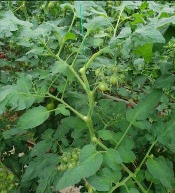 Bij de onbelichte teelt hangen er nog -5-6 trossen aan de plant. De uitgroei van de bovenste vruchten oogt prima. (zie foto links) Producties liggen gelijk tot wat achter op verleden jaar. 90 % van de planten staat super, 10 % herstellende van geelverkleuring, zwakte of gele stengel. Gelukkig staan de meeste planten wel sterk, getuige de palen van dieven!
