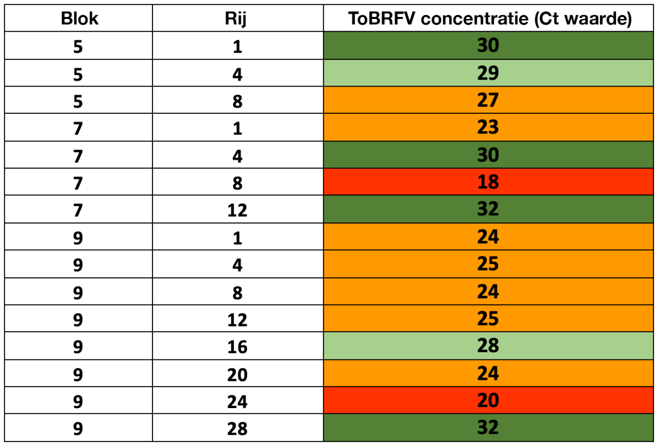 De onderstaande tabel toont een voorbeeld van de verschillen in ToBRFV-concentratie tussen rijen in hetzelfde blok in een kas. ToBRFV gemeten met qPCR en uitgedrukt in Ct-waarden. Rijen die niet werden gepresenteerd, zijn niet getest.