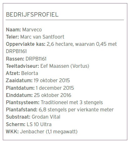 DRPB1161 is te telen op 2, 3 en 4 stengels. Marveco teelt op 3. ‘Ons watergeefsysteem is gebaseerd op 3 stengels.’