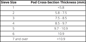 Pods vary in their lengths and diameters, and specific diameters are required for certain uses. Pod diameter is indicated as “sieve size” (Table 1).2 The beans harvested from a planting will vary in size somewhat, but it is desirable for most of the pods to be of the target sieve size, with the rest in the size categories just above and below the target. For standard processing uses, most of the pods should have a sieve size of 5, with a few in the 4 and 6 size categories. Smaller sized pods can be required by processors that are packing whole bean products. A smaller pod size is also preferred for fresh market beans, where a sieve size of 4 is standard (Figure 1). Variety descriptions often include the distribution of pod sizes typically produced by the variety.3,4 Table 1. Bean sieve sizes based on the cross-sectional diameter of the pods2