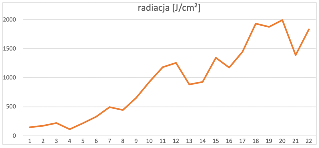 Obecnie w szklarni temperatura średniodobowa uzależniona jest od pogody, warto jednak w miarę możliwości utrzymywać rano temperaturę 16.5-17°C. Rury dolne i wegetacja powinny grzać o poranku, aby owoce nie zraszały się. Ustawienia powinny być z korektą na radiację – zwiększające się promieniowanie słoneczne powoduje zmniejszenie zadanej temperatury rur.