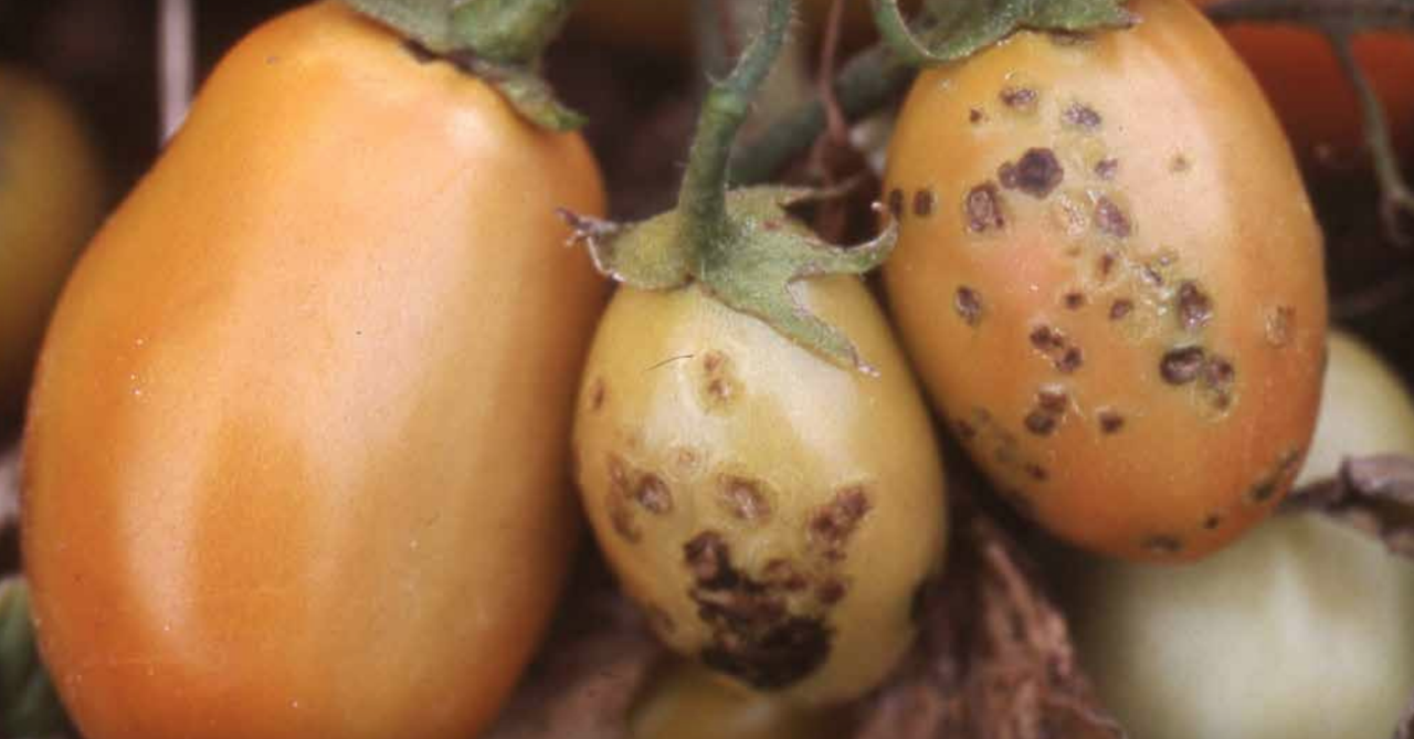 Objawy mogą wystąpić na wszystkich nadziemnych częściach rośliny. Pierwsze z symptomów, jakie można zaobserwować na liściach, to ciemne, wodniste, okrągłe plamki o średnicy nieprzekraczającej 3 mm. Plamki te z czasem przybierają kanciasty kształt. Ich powierzchnia może wyglądać na tłustą. Plamki mogą mieć przejrzysty środek i czarną obwódkę. Środek zmian szybko schnie i pęka, a wokół nich może wytwarzać się żółta otoczka. Na młodych liściach zmiany są liczniejsze. W okresie, gdy panuje duża wilgotność (obfite deszcze, mgły lub rosa), liście przybierają nietypowy rdzawy odcień. Infekcje owoców zaczynają się od drobnych, czarnych, wypukłych plamek, które mogą być okolone białą, tłustawą obwódką. Zmiany te mogą powiększać się do średnicy 4–5 mm i stawać się brązowe, nieco uniesione i podobne do parchów. Mogą też mieć wypukłe brzegi, ale zapadnięty środek.