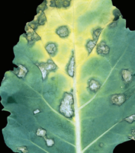 White leaf spot occurs on turnips, Chinese cabbage, Chinese mustard, cabbage and broccoli, and infrequently on cauliflower. Oval lesions with gray, brown or nearly white centers and dark margins form on cotyledons, leaves and petioles. When lesions are numerous, affected foliage may turn yellow and senesce.