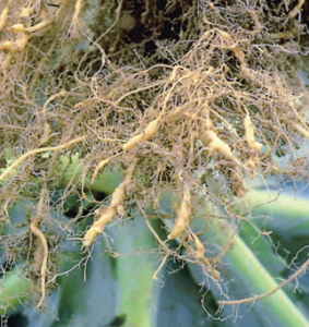 Symptoms of this disease are similar to those of clubroot, but clubroot-affected plants produce larger, more continuous swellings on the older portion of their roots. Root-knot nematodes on crucifers induce prolific root branching and galling above the point of infection. Invasion of infected roots by fungi may occur. Aboveground symptoms include stunting, chlorosis and wilting. Though infected plants may survive a growing season, the resulting crop is generally small and may be unmarketable.