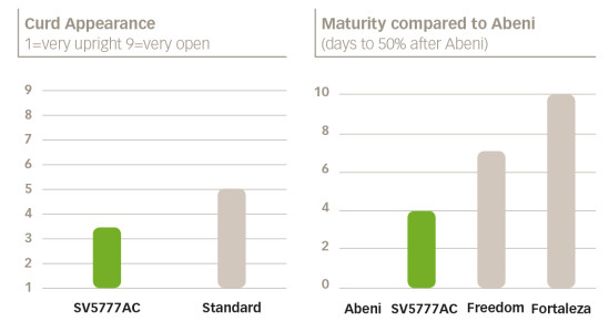 SV5777AC is our new, vigorous, second early cauliflower maturing between Abeni and Freedom. This second early cauliflower complements Momentum and Abeni to fill our early cauliflower portfolio. SV5777AC has a vigorous, upright plant habit giving a well-covered curd, which is suitable for covered and uncovered spring plantings. The final product has a solid, bright coloured curd with excellent presentation. SV5777AC has been proven to be very adaptable across all of northern Europe with consistent results over the last 4 years trials. This variety is best programmed in between our other Seminis varieties Abeni and Freedom/Fortaleza.