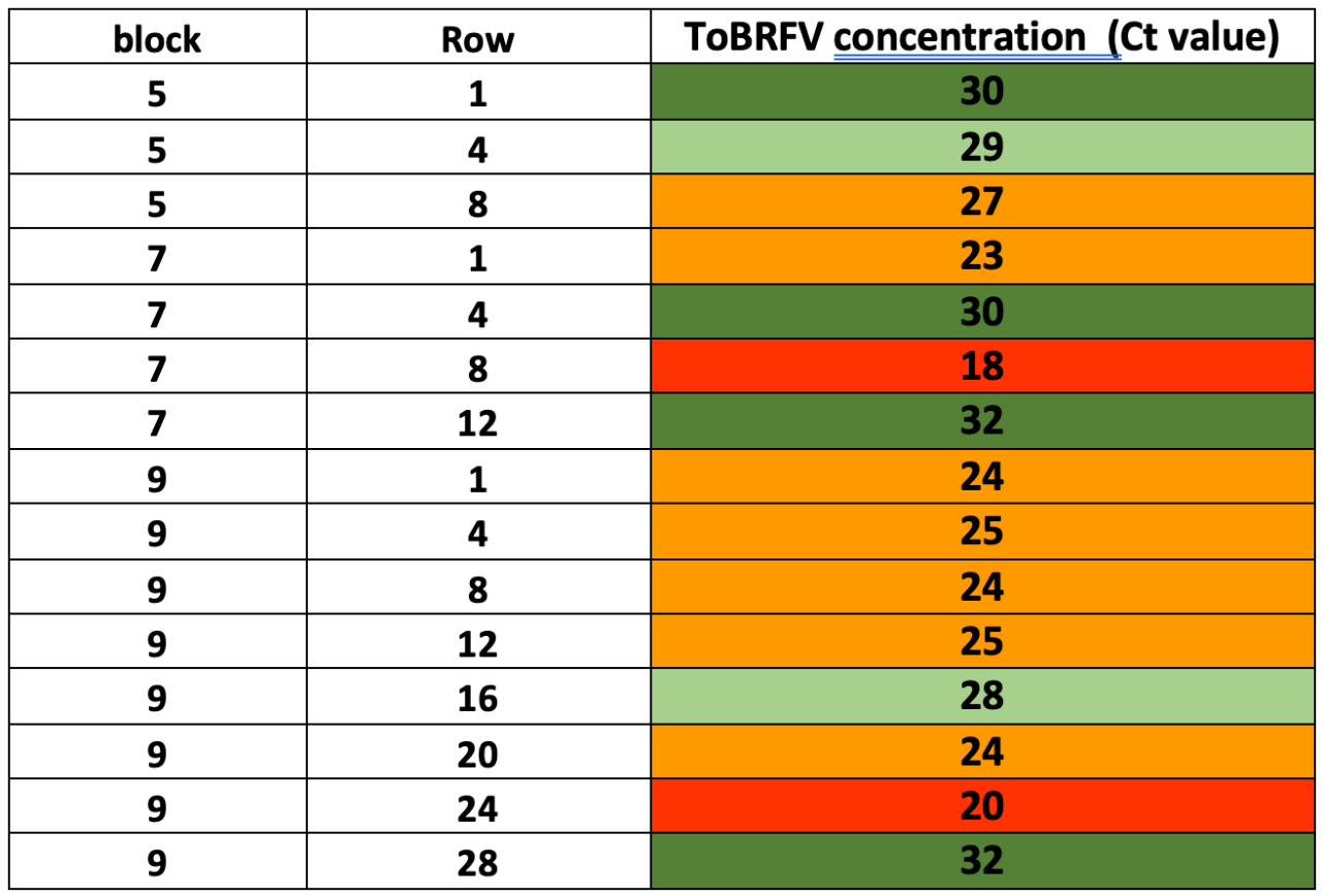 The table below shows example of the differences of ToBRFV concentration between rows in the same block in a greenhouse. ToBRFV measured with qPCR and expressed in Ct values.  Rows not presented were not tested.