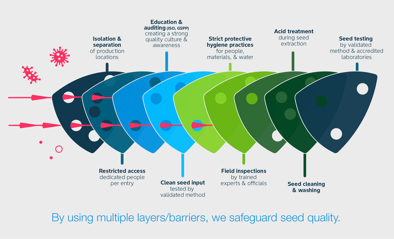• Our teams follow Clean Seed Production (CSP) standards – a fundamental hygiene program developed at Vegetables by Bayer. CSP covers Production Levels, Color Zones, Field Inspections, Training, and Hygiene Programs to mitigate risk from water, people, seeds/seedlings, materials and the environment. Protocols are set by the global field quality team and must be followed by all visitors, growers, and workers​.
